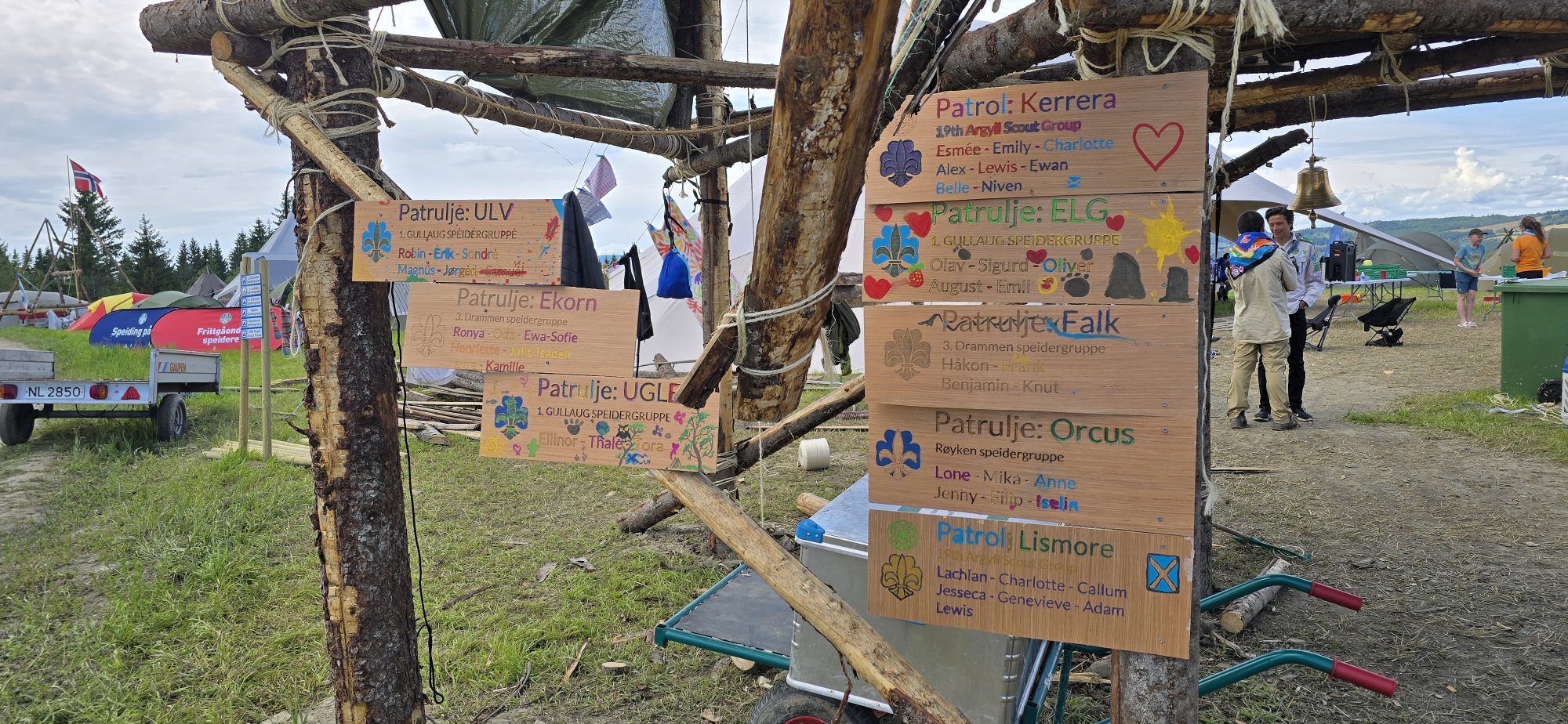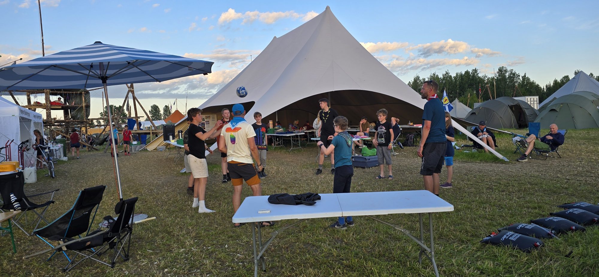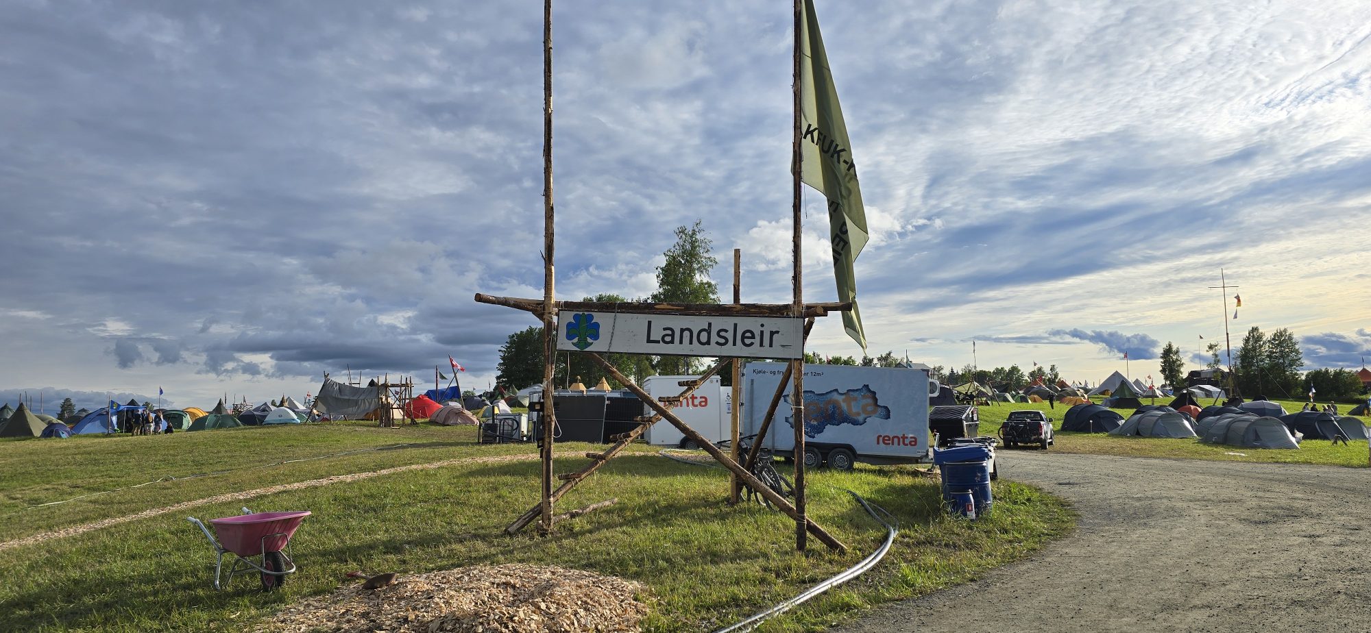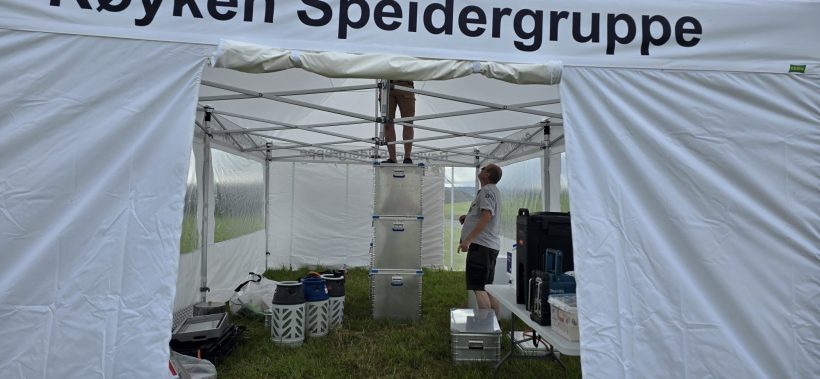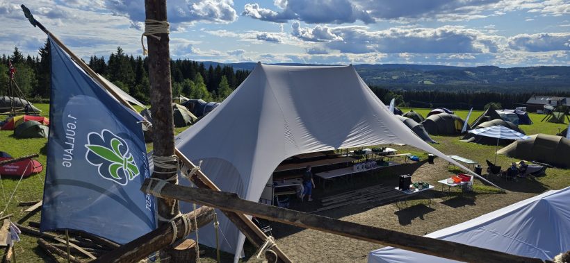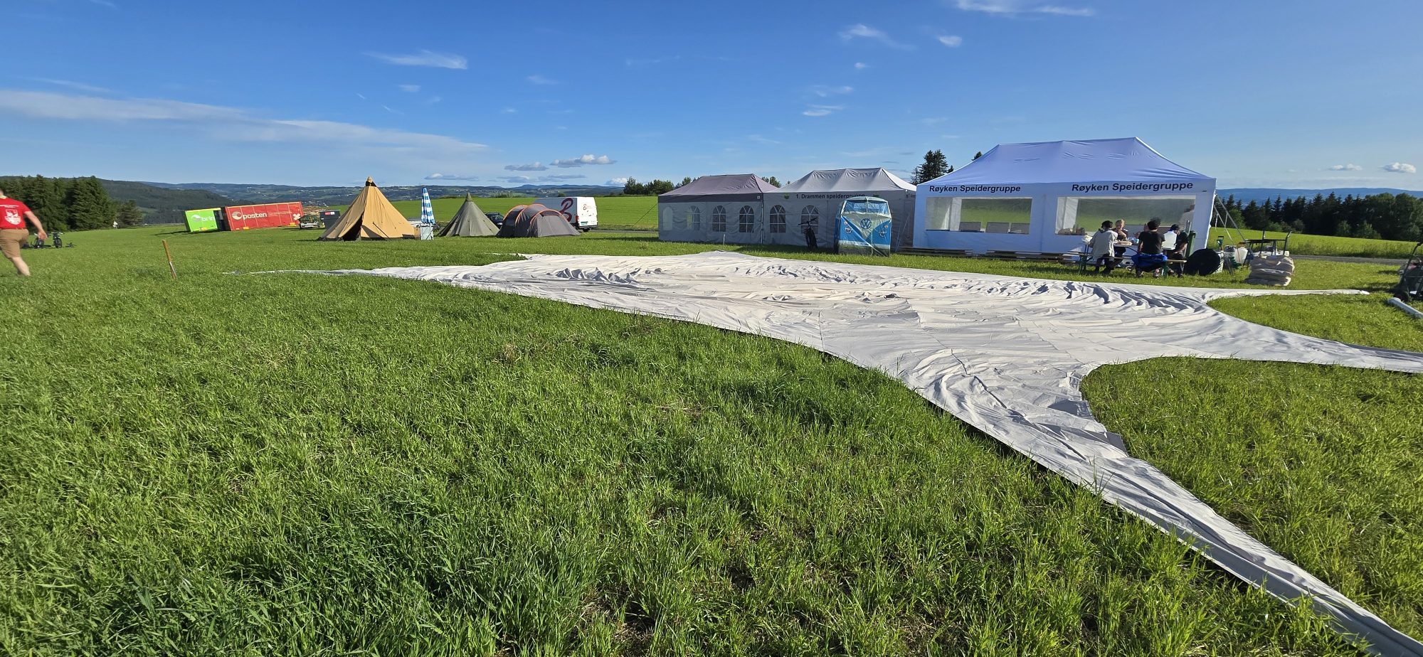 Vel fremme ble vi møtt av et yrende liv, hundrevis av speidere fra hele landet og hektisk aktivitet med å få opp teltene. Været var på vår side selvom værvarselet meldte regn hele uka, og snart var både patruljetelt og portaler på plass.