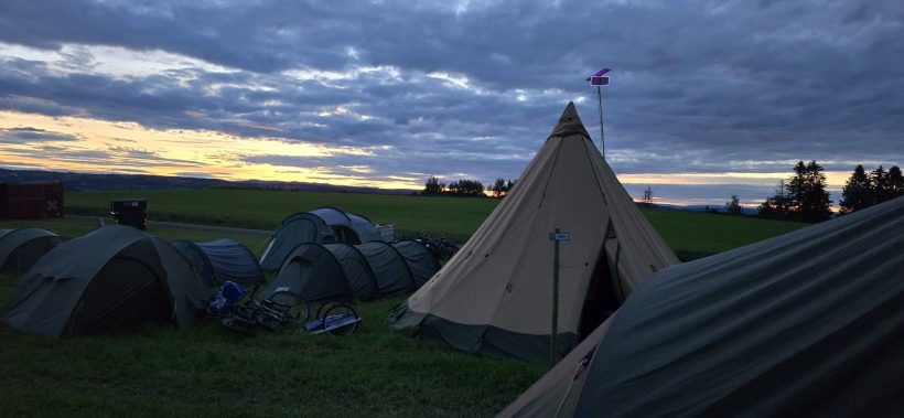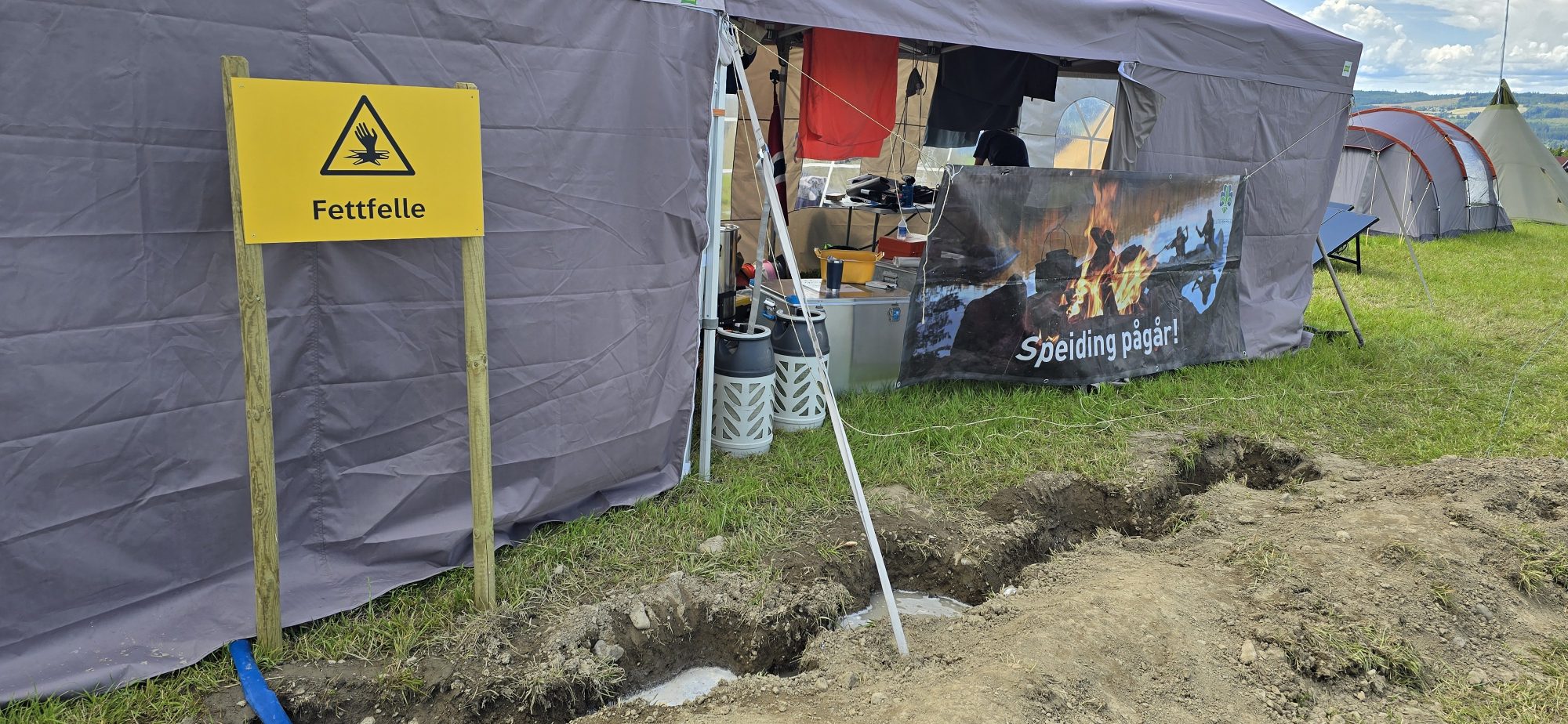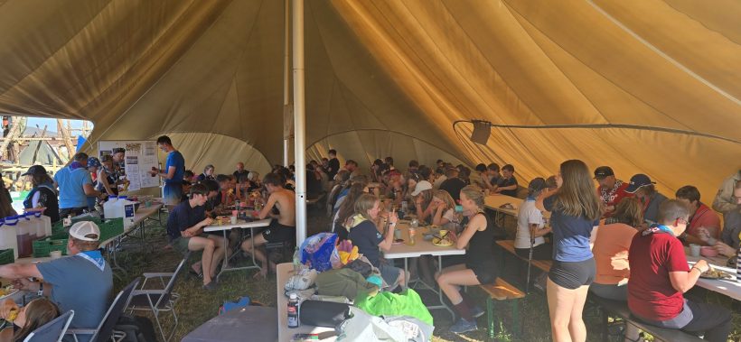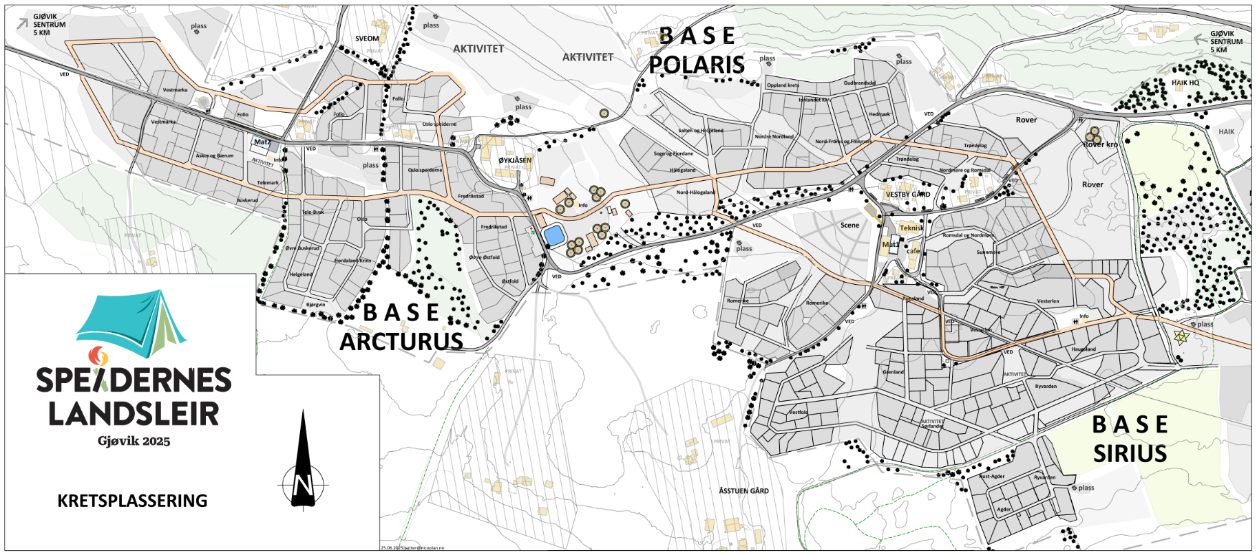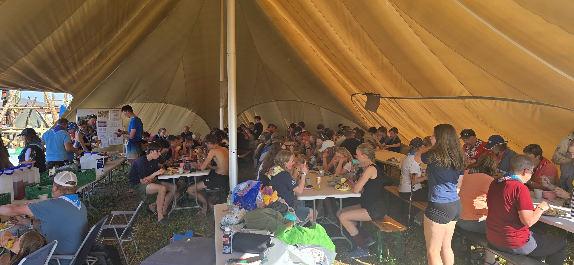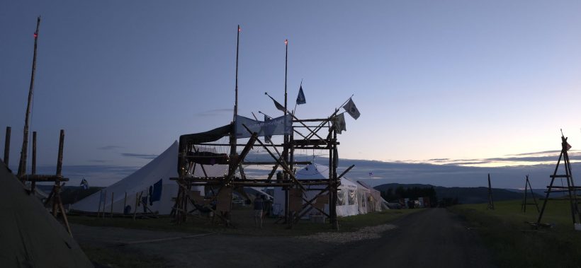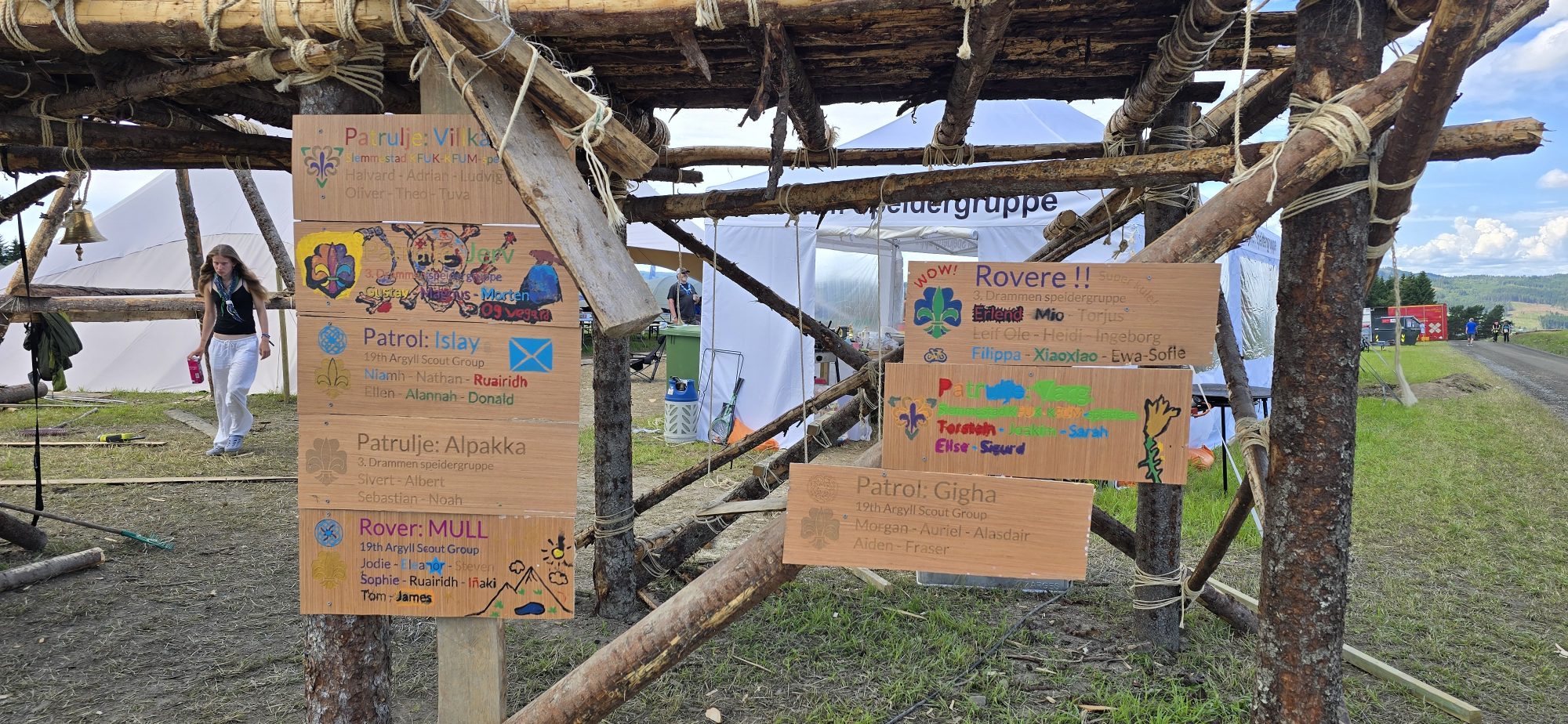 Vel fremme ble vi møtt av et yrende liv, hundrevis av speidere fra hele landet og hektisk aktivitet med å få opp teltene. Været var på vår side selvom værvarselet meldte regn hele uka, og snart var både patruljetelt og portaler på plass.